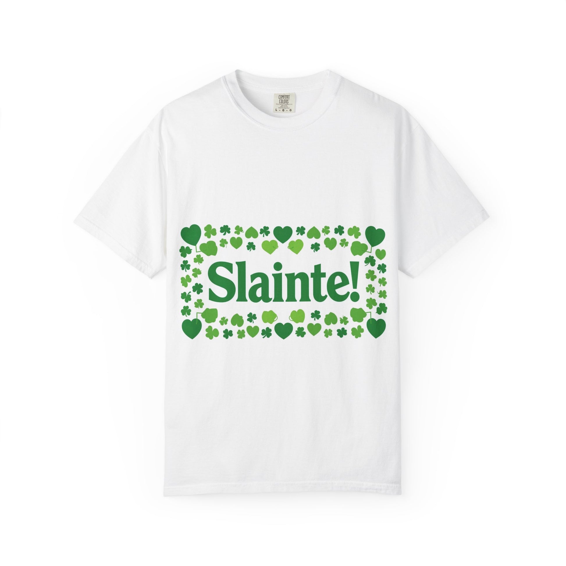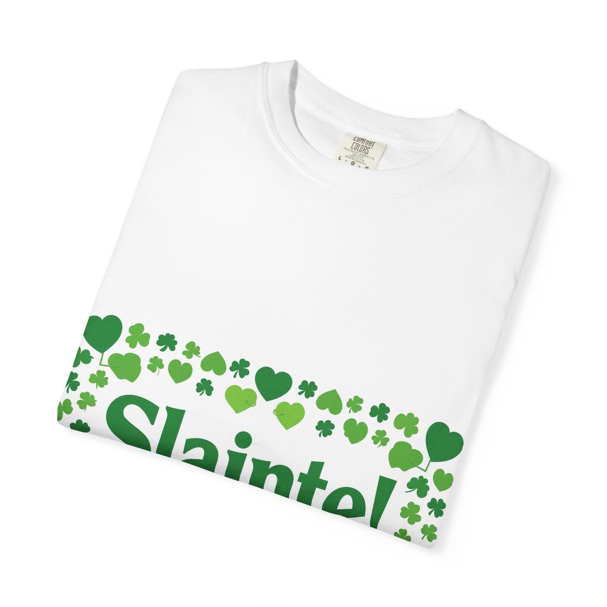 Bring a touch of Irish cheer to easy, everyday wear. This garment-dyed tee feels lived-in from the first wear—soft, slightly broken-in, and comfortable against the skin. A bold green “Slainte!” banner framed by a scatter of shamrocks and hearts sits across the chest, while a tiny shamrock marks the upper back. It’s the kind of shirt you reach for when you want to toast with friends, stroll through a festival, or add a playful, cultural note to a relaxed weekend. The heavyweight cotton and relaxed cut give it presence without stiffness, and the subtle fade of the dye adds personality to every wash.